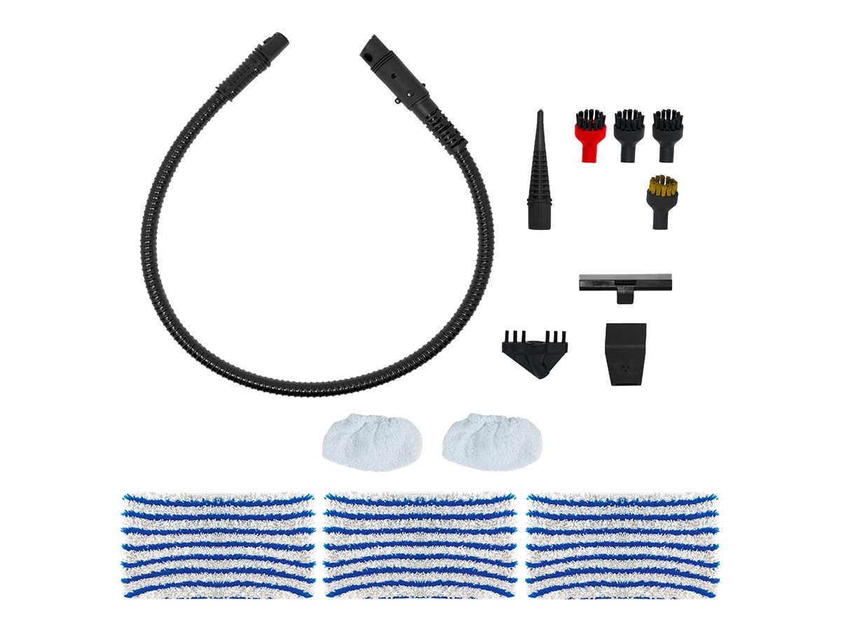 | Priedai pridėti | 3 x Floor cloths; 2x Sockettes; Flexible steam hose; Steam lance; Window cleaner frame; Round brush with brass bristles; 3 x Round brushes with nylon bristles; Grout accessory; Upholstery accessory |