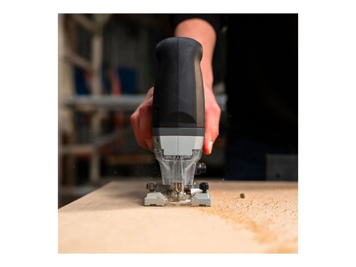 | Kitos savybės | Max. Sawing Capacity in Metal: 10 mm; Max. Sawing Capacity in Wood: 135 mm; Adjustable speed and 26 mm stroke length for clean results in wood, plastic & metal; Brushless motor delivers efficient cutting and extended tool life; LED light and self-blower keep the cutting line visible and dust-free |