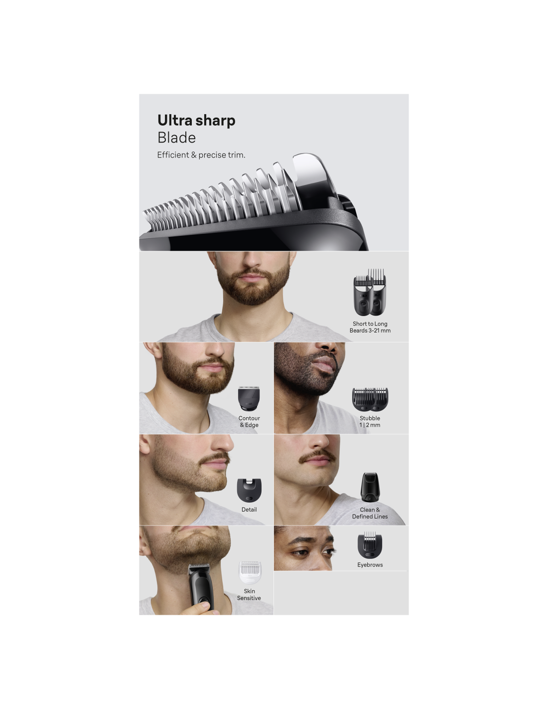 | Pritvirtinamos šukos | Sliding Beard Comb 3-11 mm, Sliding Hair Comb 13-21 mm, Sensitive comb (Skin), Fixed combs with 1 mm & 2 mm, Eyebrow Comb, Detail Comb |