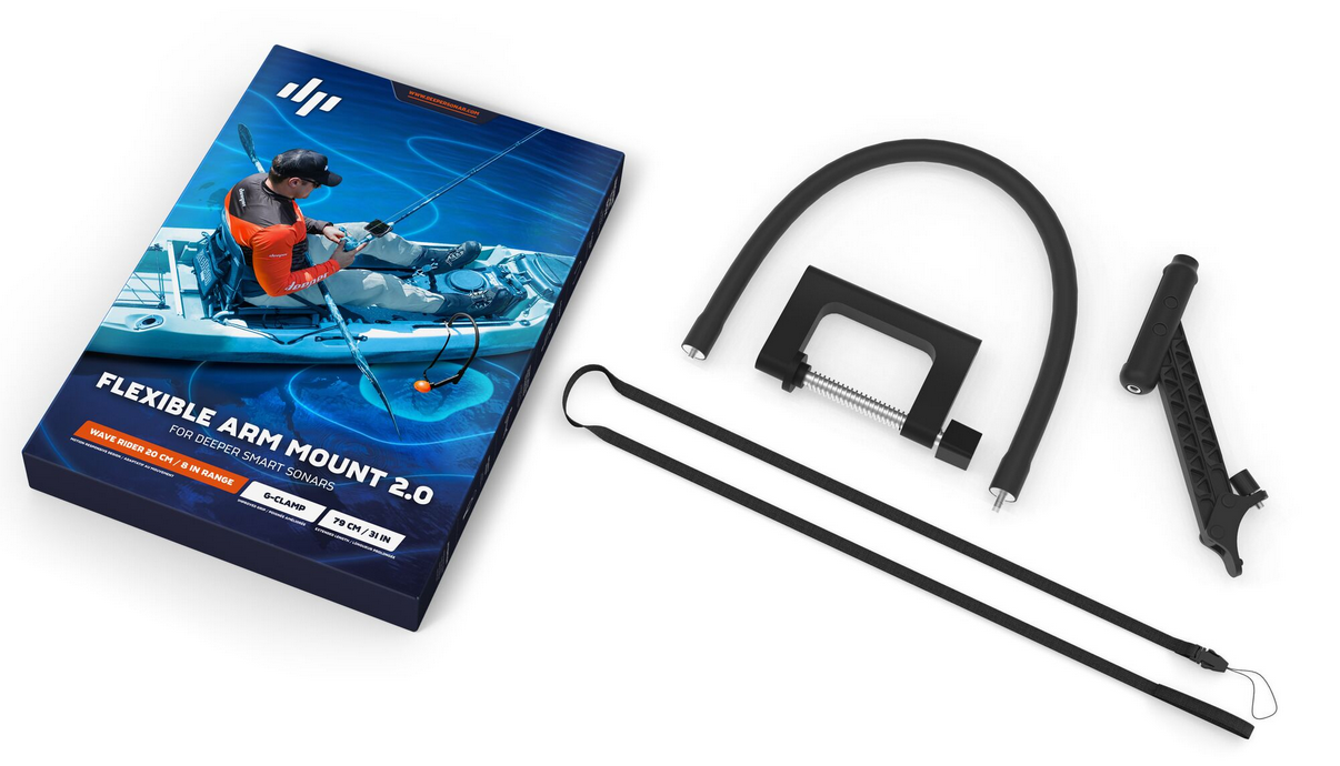 | Kitos savybės | The Flexible Arm Mount 2.0 boasts a range of new features that improve usability and versatility. Foremost amongst these is its Wave Rider Motion Responsive Design, which enables your Deeper Smart Sonar to constantly float on the service of the water by moving up and down with any waves. It also offers more secure and versatile mounting to your vessel thanks to its 70 mm G-Clamp. The length has been extended to 79cm / 31in, offering greater flexibility with mounting position and making it suitable for an even wider range of vessels. |