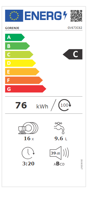 Dishwasher | GV673C62 | Built-in | Width 59.8 cm | Number of place settings 16 | Number of programs 7 | Energy efficiency class C | AquaStop function | Does not apply