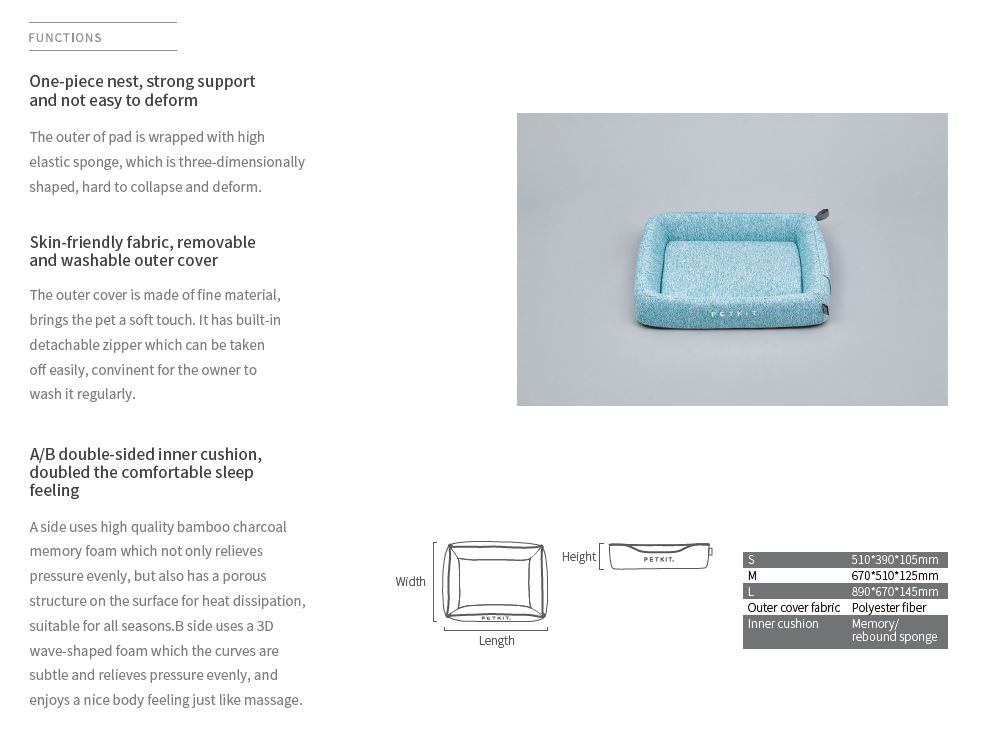 | Kitos savybės | The outer cover is made of fine material, brings the pet a soft touch. It has built-in detachable zipper which can be taken off easily, convinent for the owner to wash it regularly. |