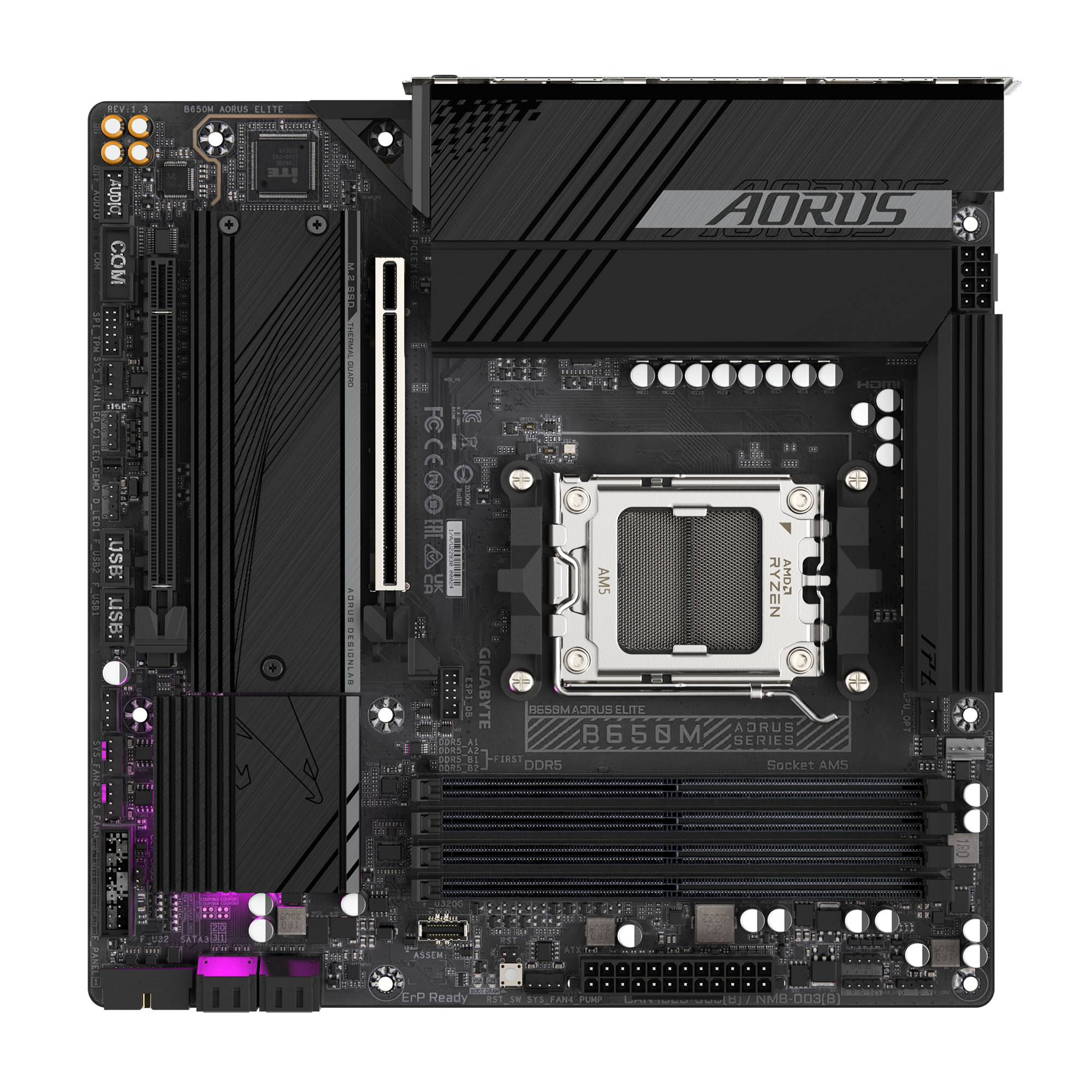 Gigabyte B650M AORUS ELITE (rev. 1.3) | Processor family AMD | Processor socket AM5 | DDR5 | Supported hard disk drive interfaces SATA, M.2 | Number of SATA connectors 4