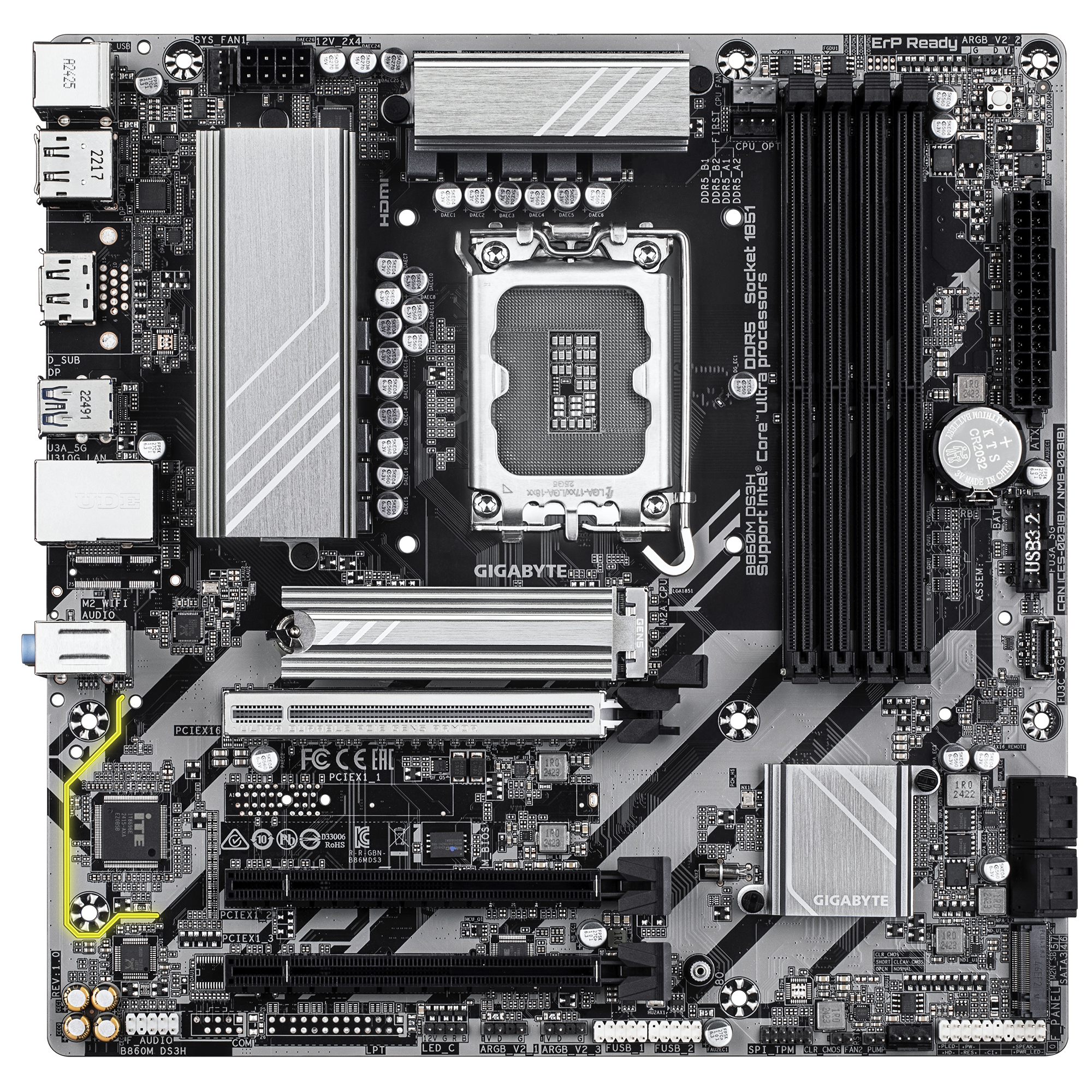 Gigabyte B860M DS3H | Processor family Intel | Processor socket LGA1851 | DDR5 | Supported hard disk drive interfaces M.2, SATA | Number of SATA connectors 4