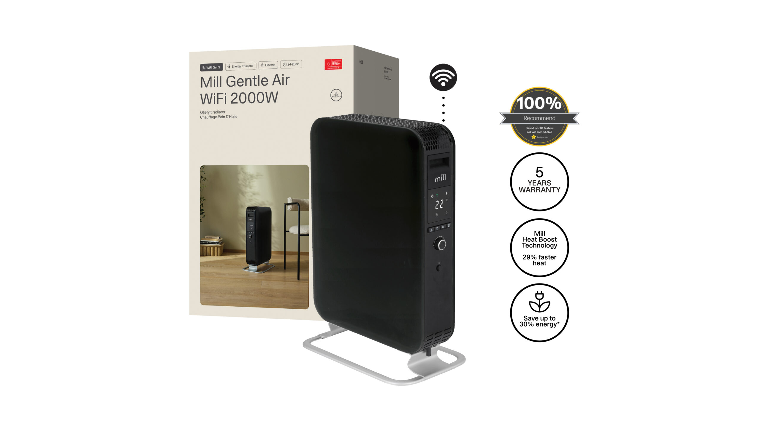 Mill | WiFI GEN3 Oil Filled Radiator | OIL2000WIFI3 | Oil Filled Radiator | 2000 W | Number of power levels 3 | Black