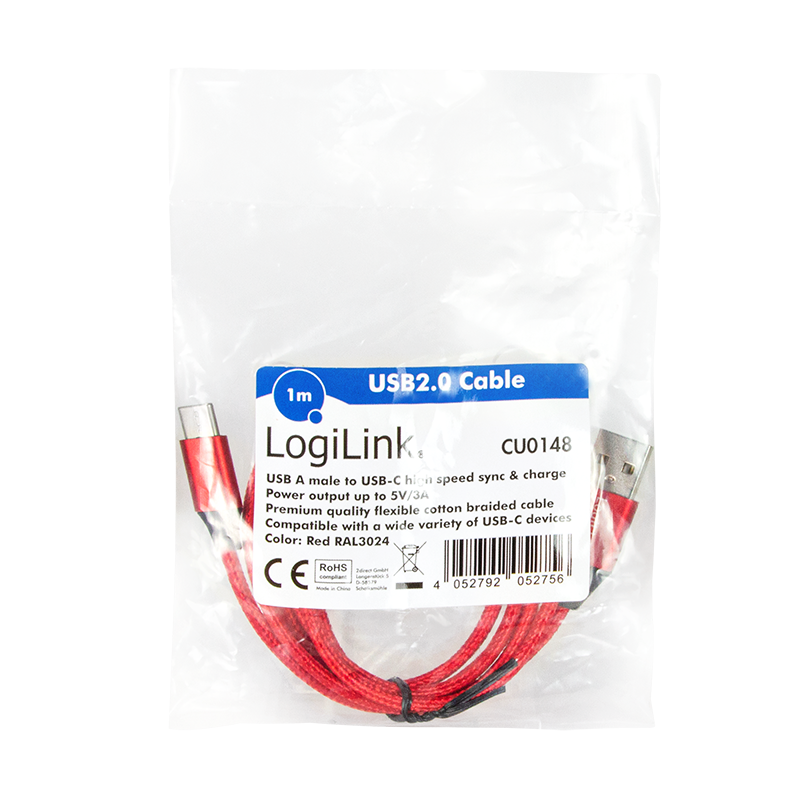 | Kitos savybės | To synchronize and charge your USB devices. USB-A male to USB-C male. Power output up to 5V/3A. Premium quality flexible cotton braided cable. Compatible with a wide variety of USB-C devices. Color: Red. |