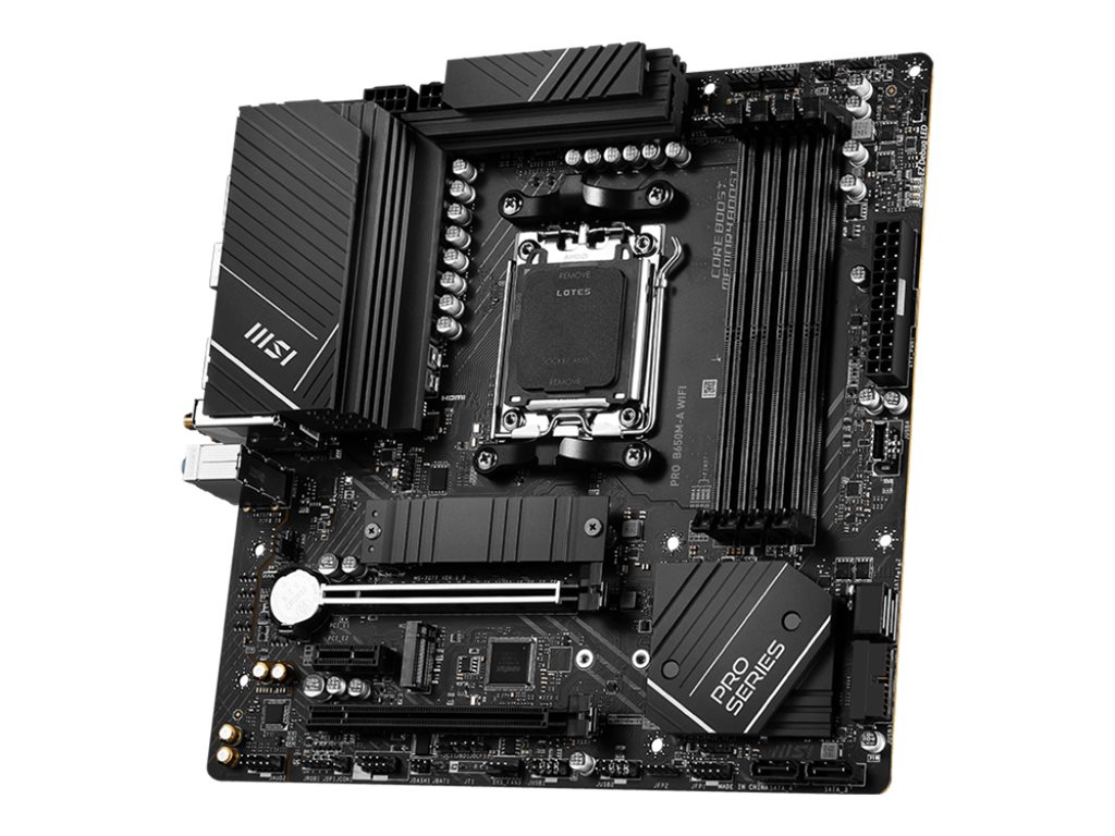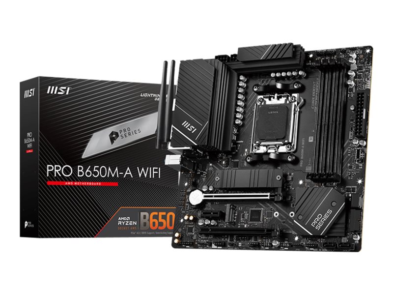 MSI | PRO B650M-A WIFI | Processor family AMD | Processor socket AM5 | DDR5 DIMM | Memory slots 4 | Supported hard disk drive interfaces SATA, M.2 | Number of SATA connectors 4 | Chipset AMD B650 | mATX