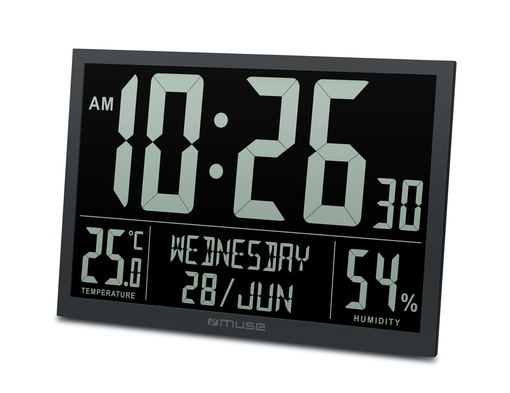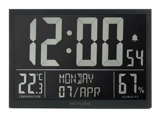 Funkcijos Full digits display of day of week and 3 digits display of month, Temperature & humidity, Calendar, alarm and clock function, Wall mount or table stand design
