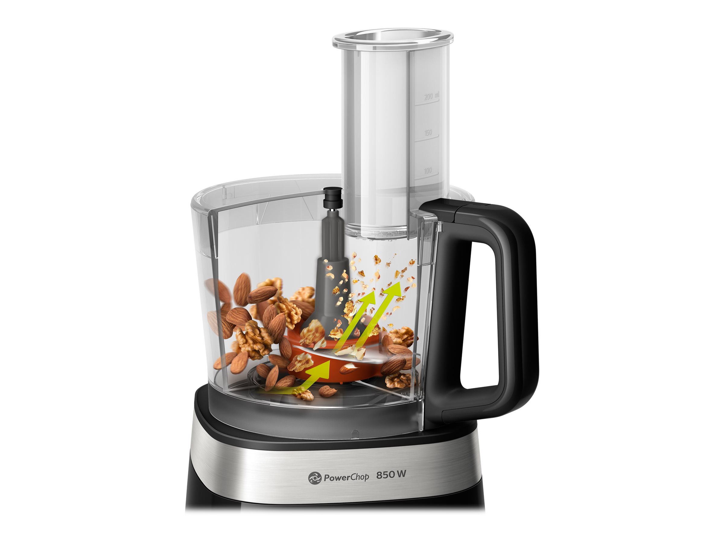 | Specialios funkcijos | The PowerChop technology is a combination of blade shape, cutting angle and inner vessel that allows you to perfectly cut both soft and hard products |