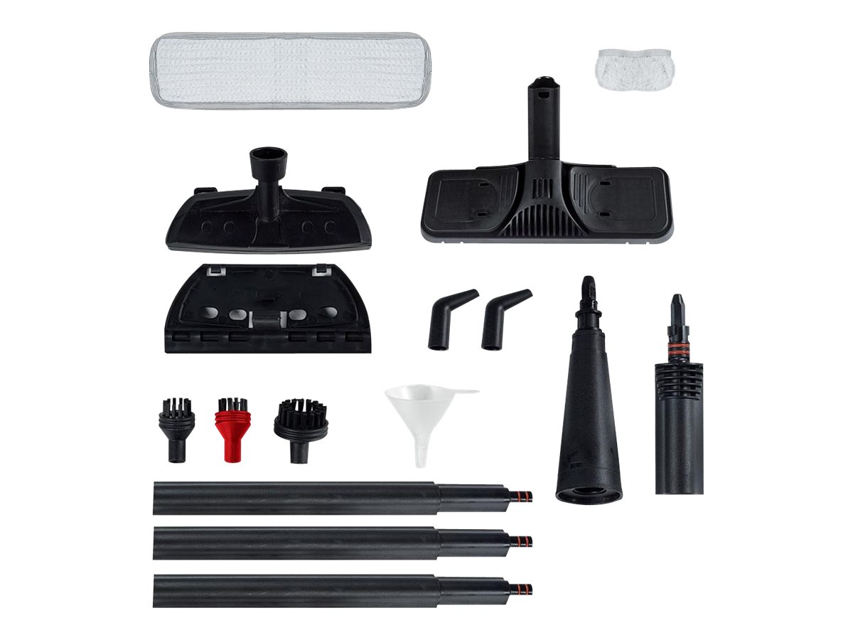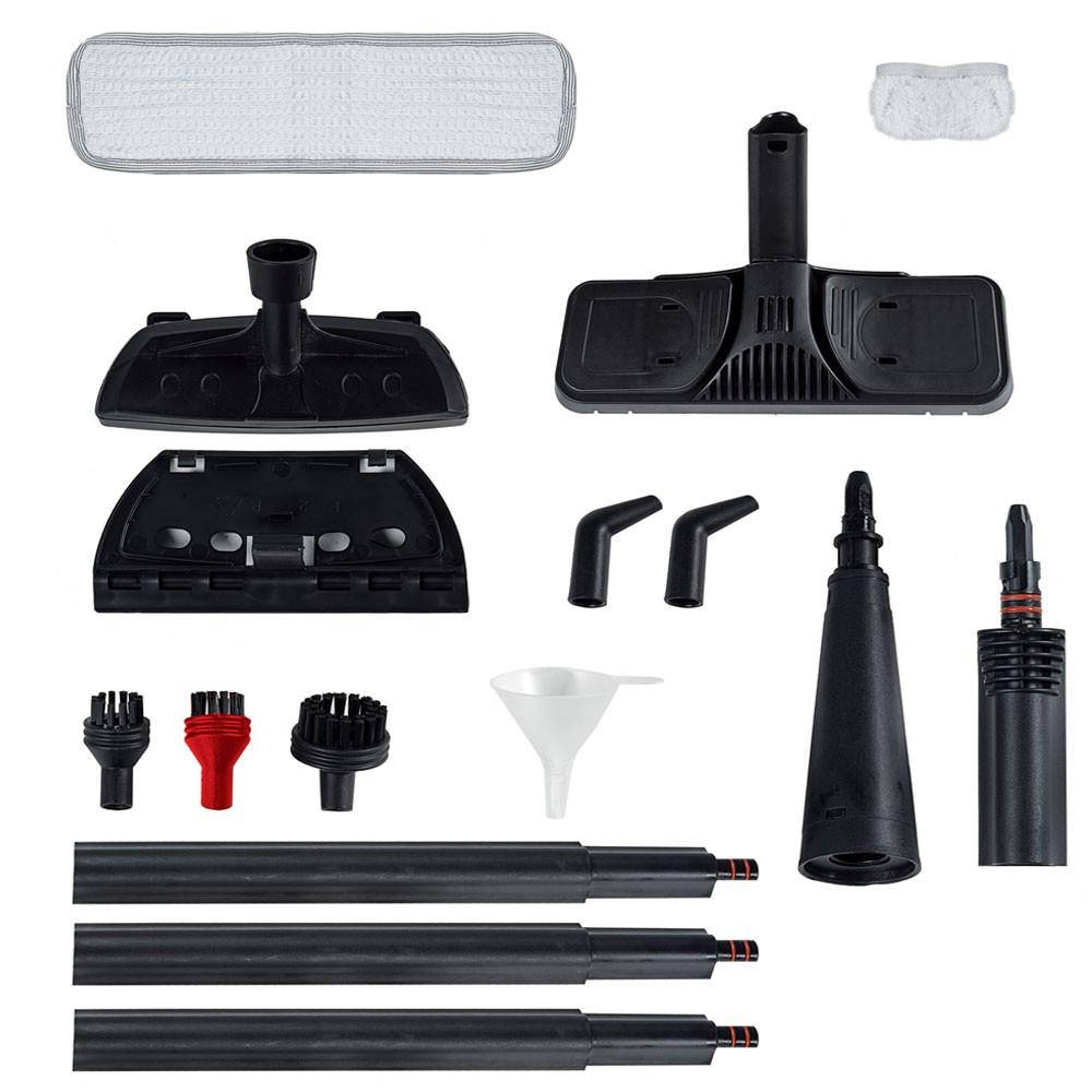 | Priedai pridėti | 12 included accessories: floor brush, floor cloth, sockette, 3 small brushes with nylon bristles, accessories adapter, small brush with window cleaning kit, steam concentrator, steam lance, funnel. |