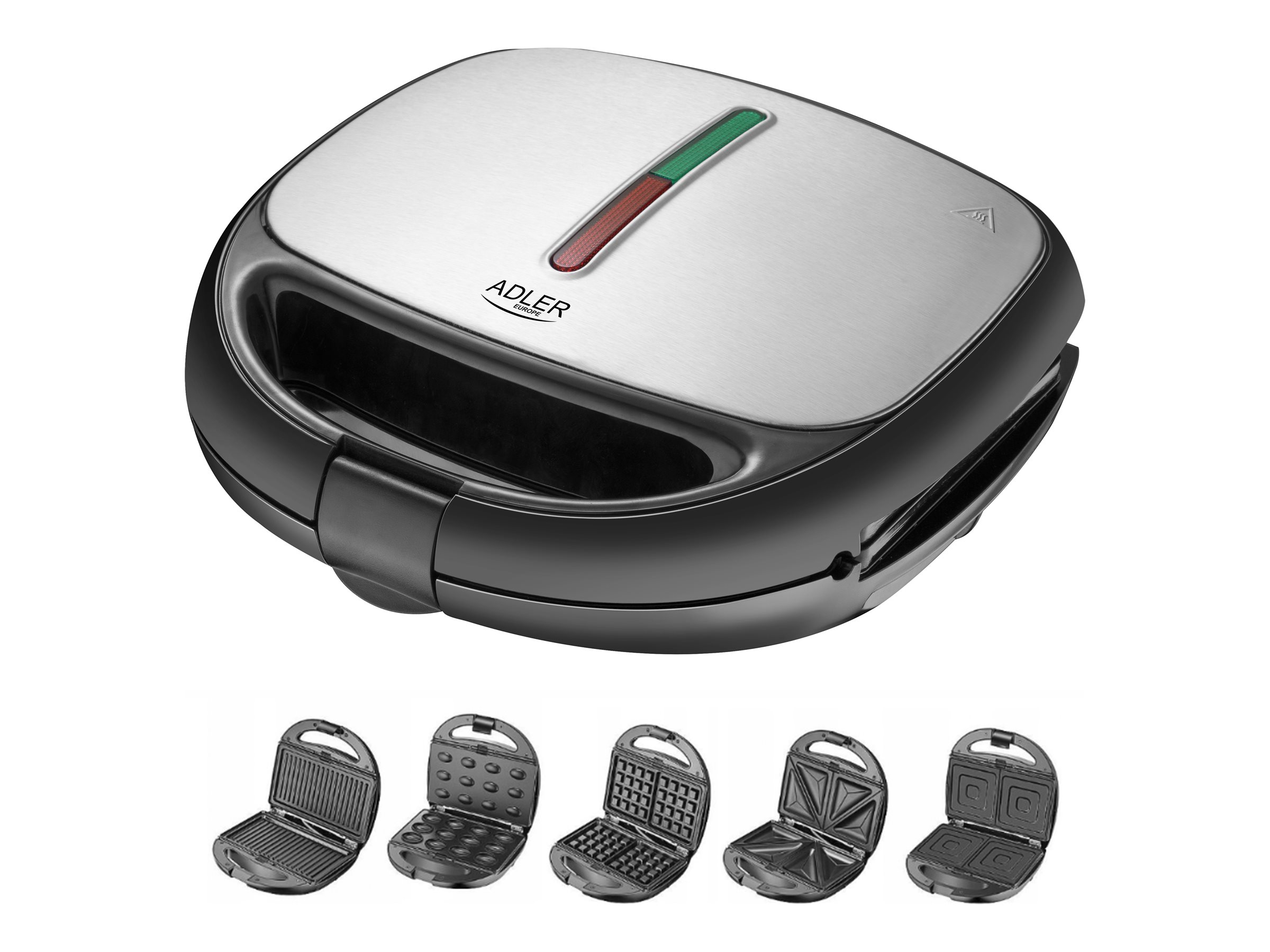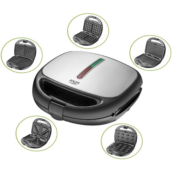Adler | Sumuštinių keptuvė | AD 3040 | Lėkščių skaičius: 5 | Daugiafunkcis grilis | Tešlos formų skaičius: 2 | 1200 W | Keraminė danga | Juoda