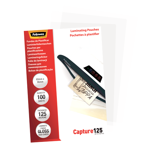 Fellowes | Laminating Pouch – 65x95mm | Glossy | Ideal for identity cards, credit cards, business cards and visitor cards; Capture 125 Micron thickness – providing an advanced level of document protection; Pack size of 100; Compatible with all laminator brands