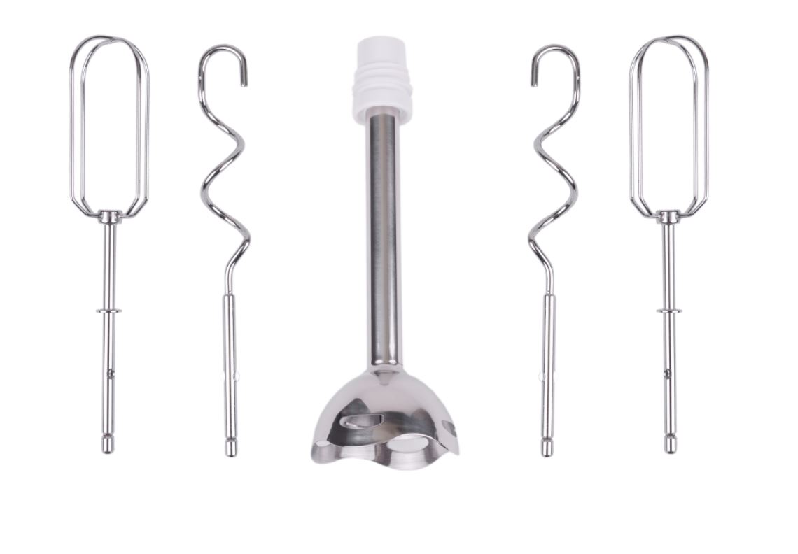 Priedai pridėti Two beaters and two dough hooks made of stainless steel; Stainless steel blending shaft attachment