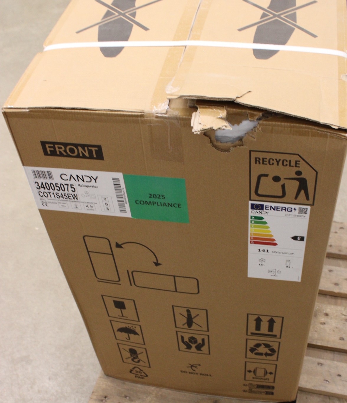 IŠPARDAVIMAS. Candy šaldytuvas | COT1S45EW | Energy efficiency class E | Free standing | Larder | Height 84 cm | Fridge net capacity 91 L | Freezer net capacity 15 L | 39 dB | White | PAŽEISTA PAKUOTĖ, DENT ON FRONT DOOR