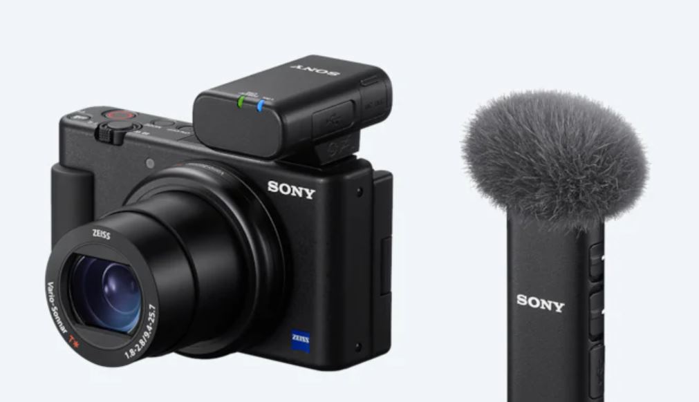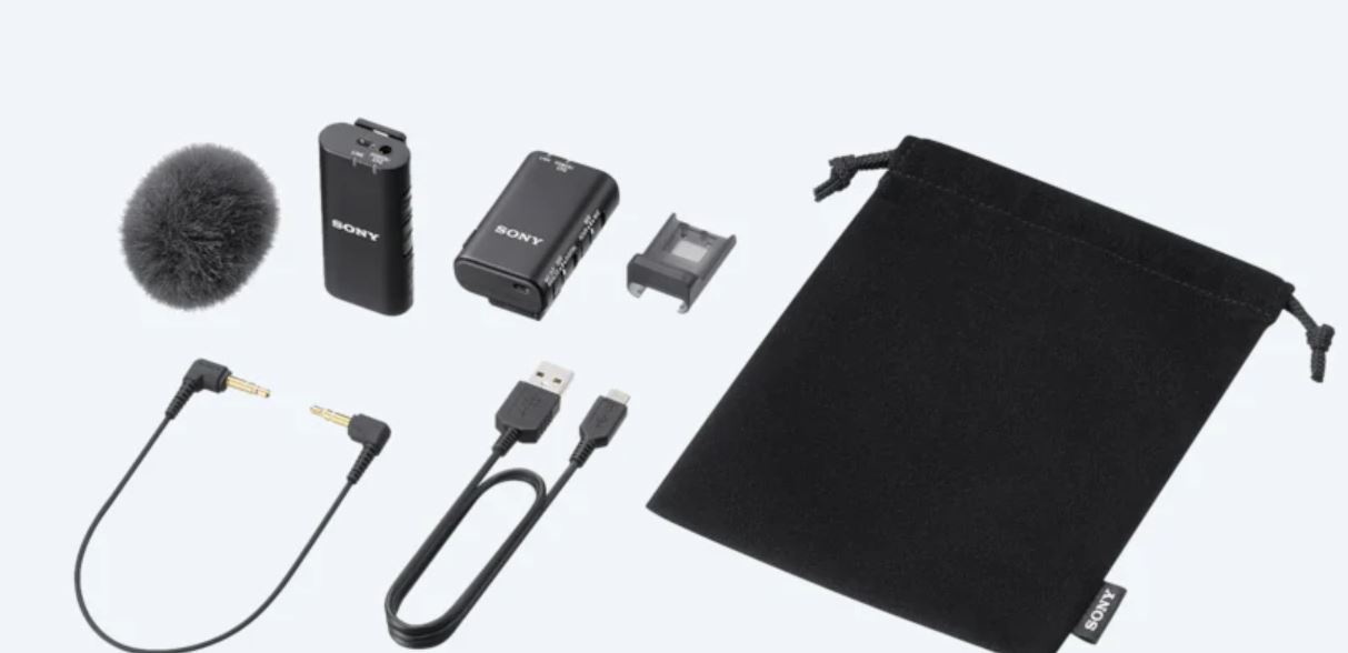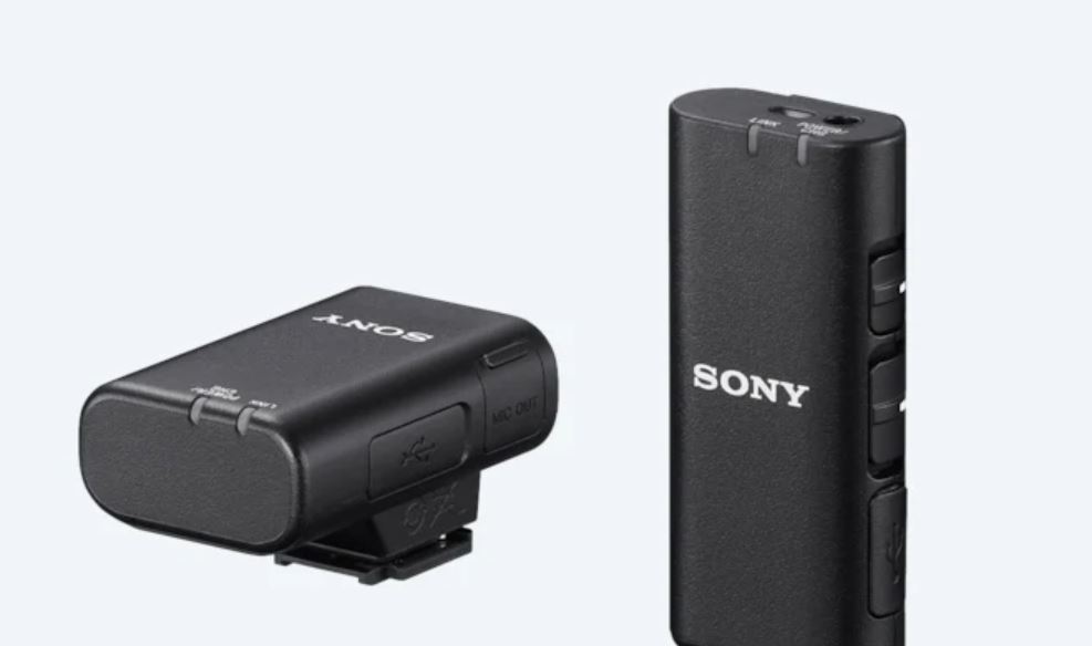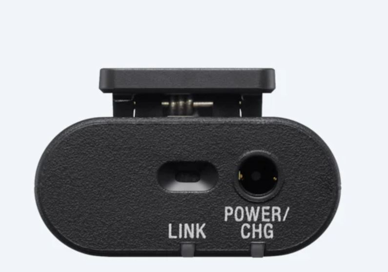 Sony | Wireless Bluetooth Microphone | ECM-W2BT | Omnidirectional; Clear, cable-free digital transmission; High-quality audio transmission from microphone to receiver; 9 hours battery life; Stable, uninterrupted audio recording; Safeguards to prevent recording failures; Product image showing the 3.5mm stereo mini-jack on top of the transmitter Expandability with 3.5mm stereo mini-jack